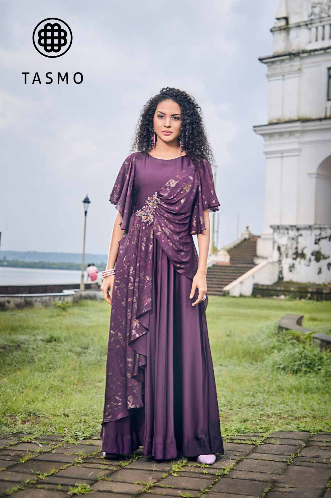 Regal amethyst Italian silk georgette, hand-embroidered florals by TASMO artisans. Asymmetrical capelet flows like liquid twilight—exquisite, in-house mastery.