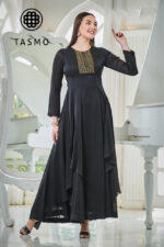 Exude timeless elegance in this TASMO black luxe gown, crafted from a premium silk-georgette blend for a graceful, flowing silhouette. The design features cascading drapes and a hand-embellished golden bodice, adding a touch of refined opulence. Perfect for evening soirées and special occasions, this piece blends modern sophistication with effortless charm.