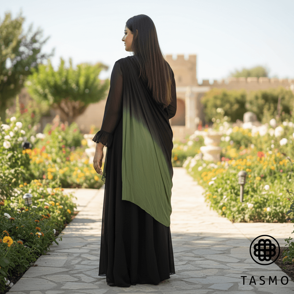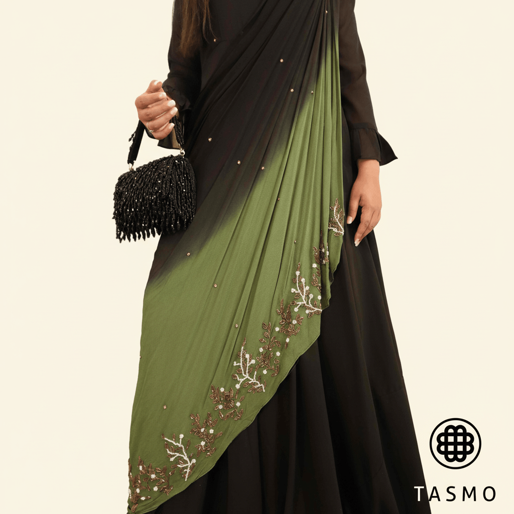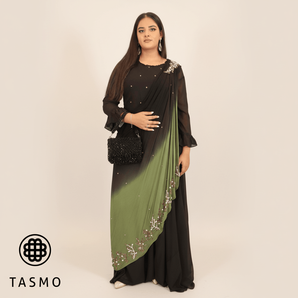 Draped in a whisper-soft cascade, this gown exudes refined opulence. The black base rests beneath an emerald panel that sweeps from shoulder to hem, shaping an elongated, graceful silhouette. Delicate embellishments along the drape shimmer with movement, while sheer sleeves add cathedral-like elegance and sculpted pleats at the bodice provide depth without clutter.