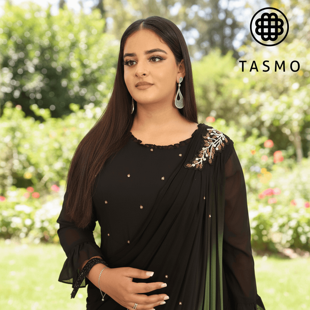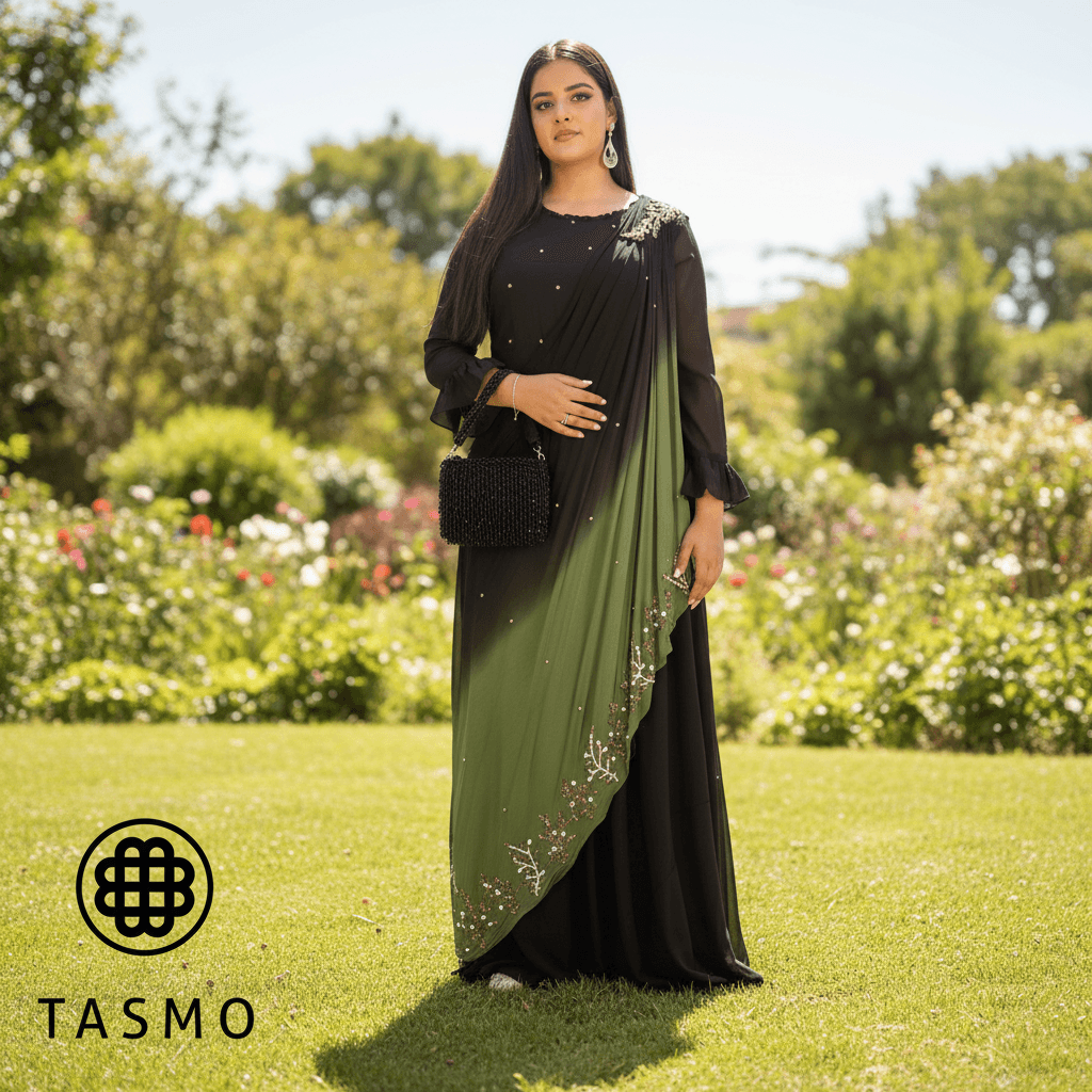 A hand-stitched floral motif edges the drape, enhancing couture sophistication. The asymmetrical wrap flares the waist with subtle glamour letting the wearer’s poise take center stage. Finish with a statement clutch and understated jewelry to transform the gown into a timeless portrait of luxury.