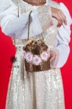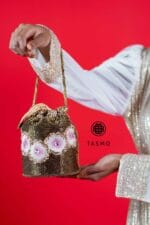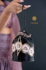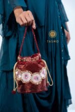 A distinctive potli bag that captures the essence of artisanal elegance, featuring a harmonious fusion of floral embroidery and intricate beadwork. This exquisite piece is designed in a rich duo of textures and patterns, making it a true statement accessory — perfect for adding a touch of timeless charm and sophistication to any festive or formal ensemble.
