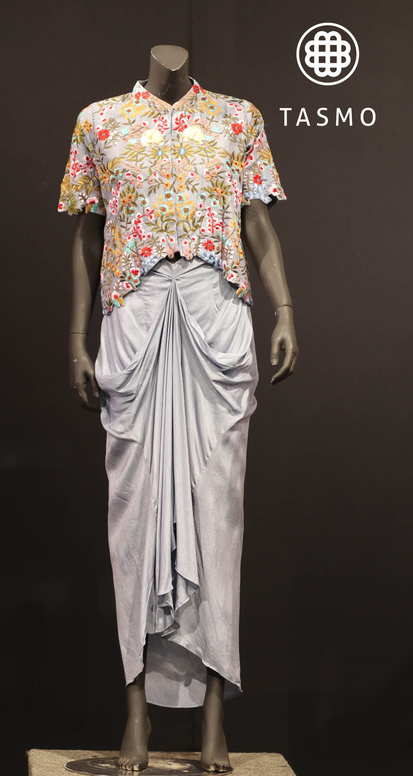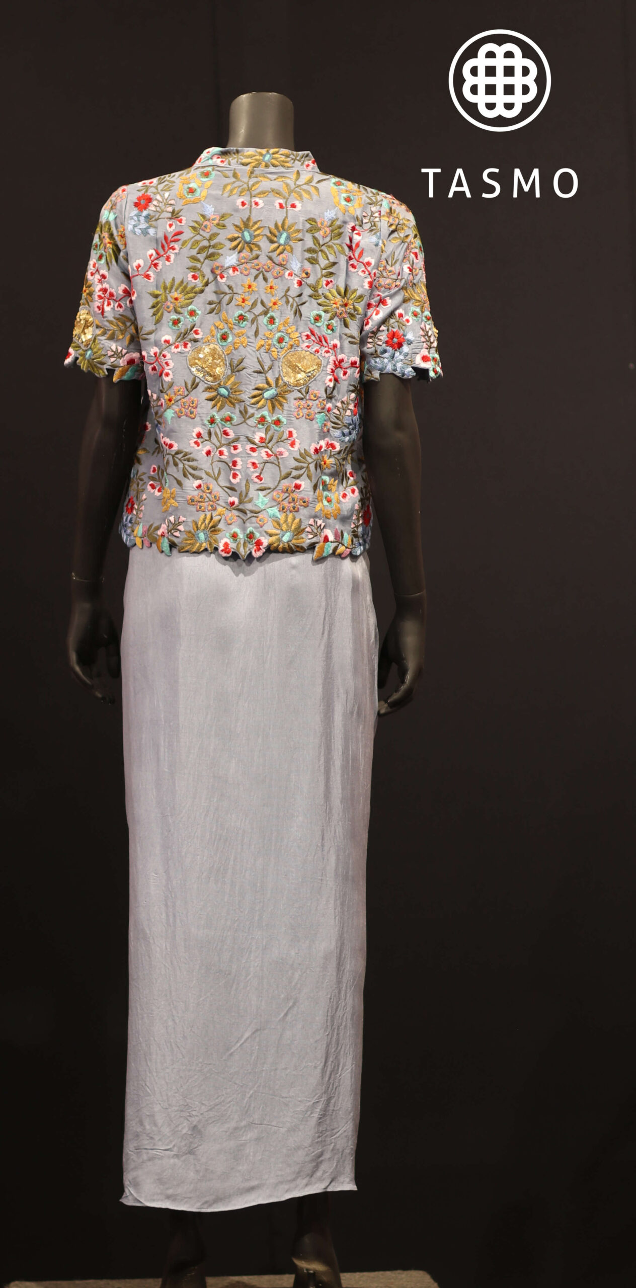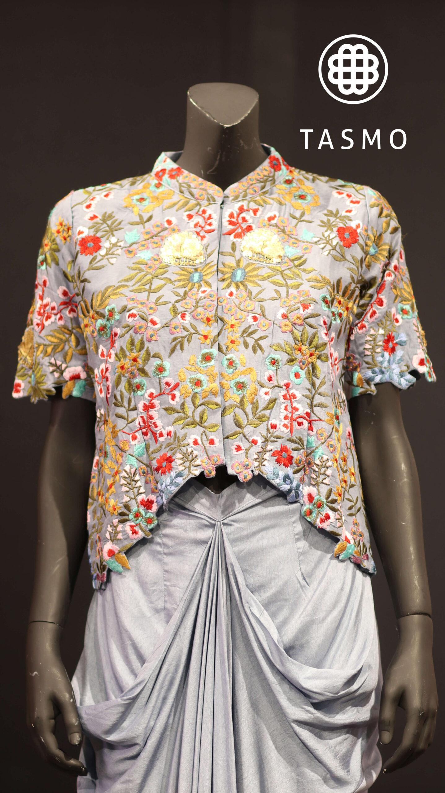 A masterpiece of artisanal finesse, this cropped jacket is delicately hand-embroidered in a rich palette of multicolored threads, each stitch echoing meticulous craftsmanship. Paired with a fluidly draped skirt that cascades with graceful movement, the ensemble embodies an opulent blend of tradition and contemporary allure—an ode to timeless elegance and elevated design.