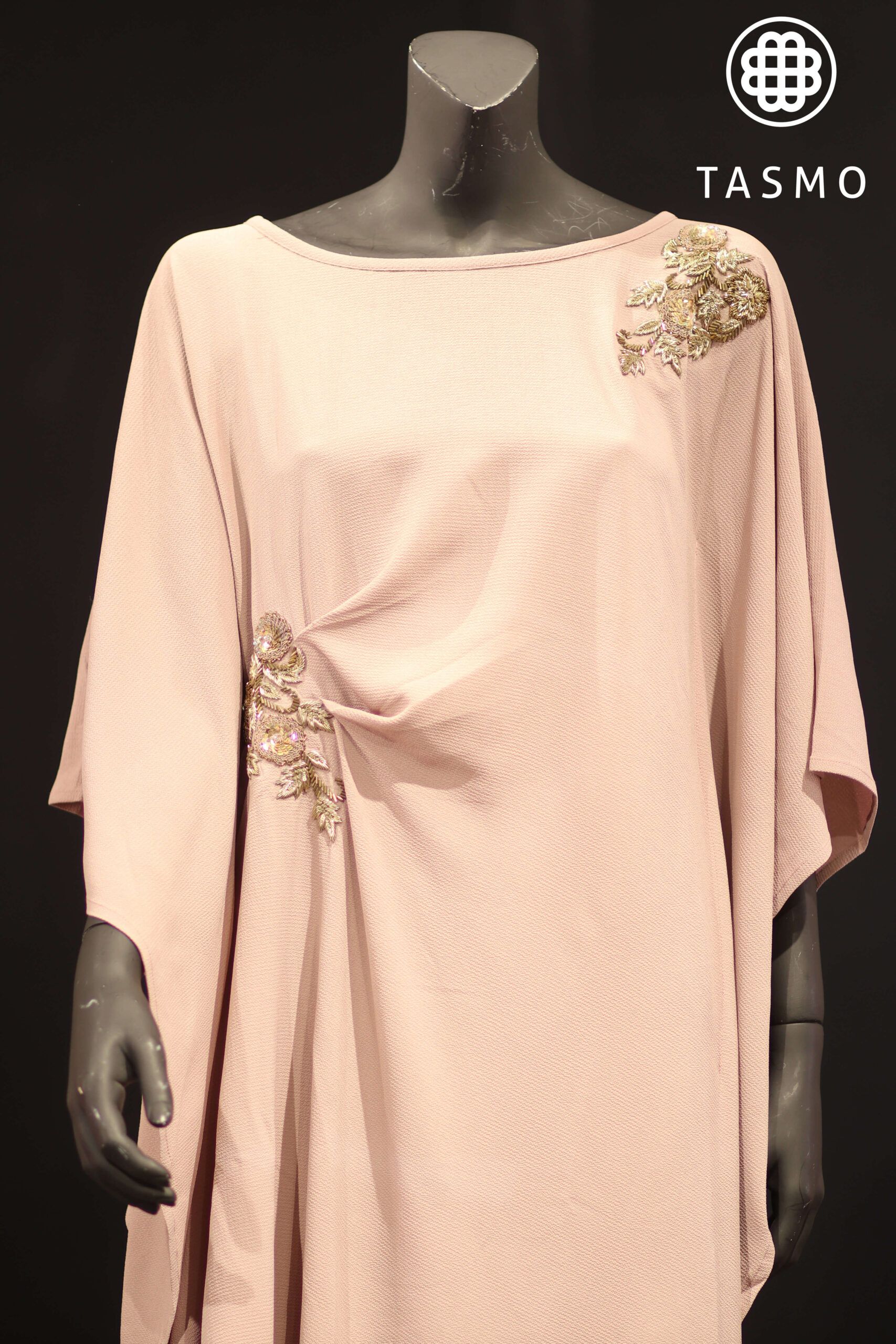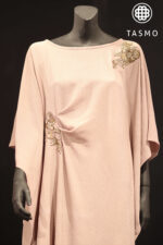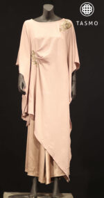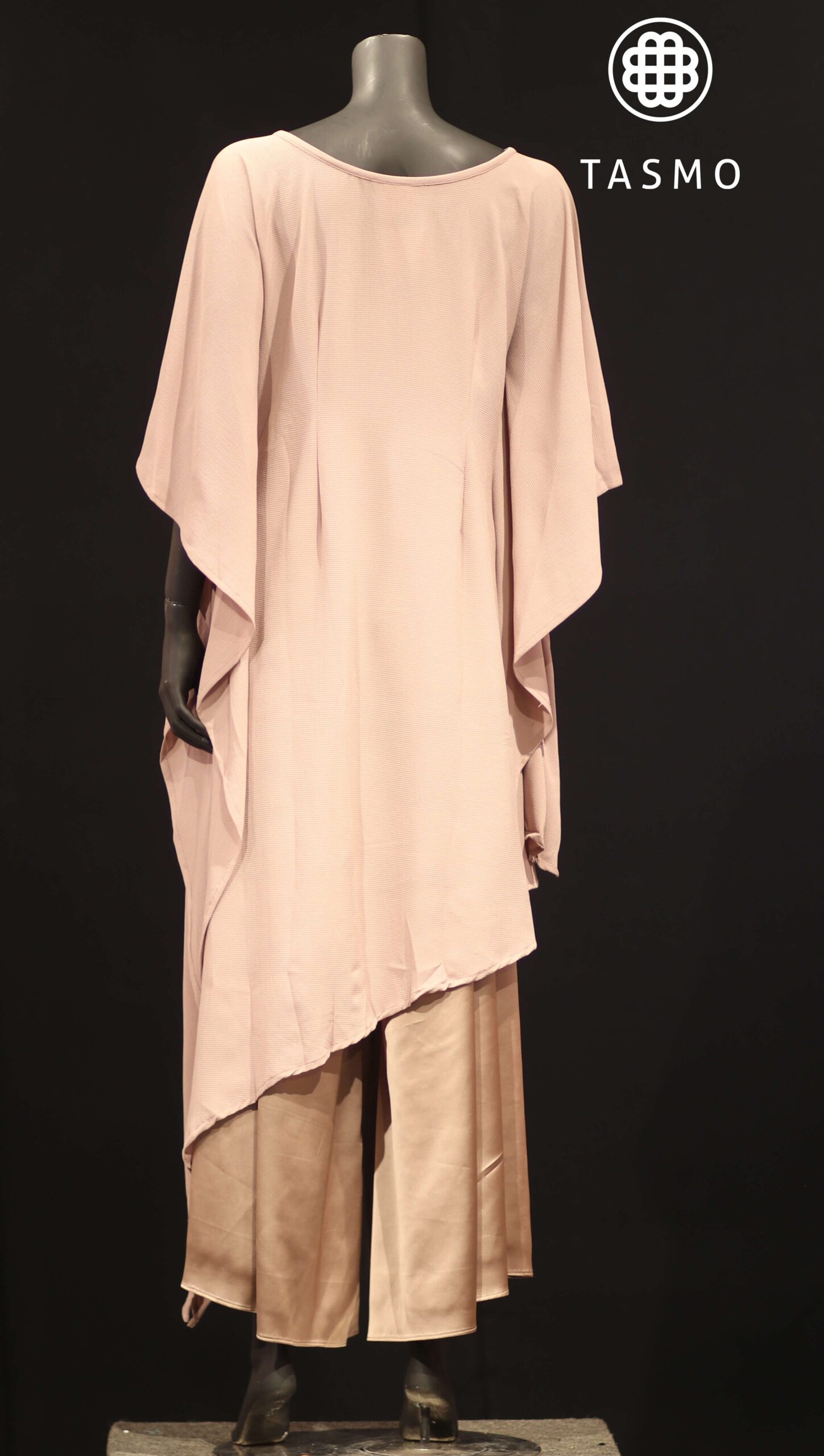 An asymmetrical tunic adorned with intricate hand-beaded motifs along the shoulder and waistline, exuding artisanal elegance. Paired effortlessly with contrast-hued silk pants for a striking yet sophisticated ensemble.