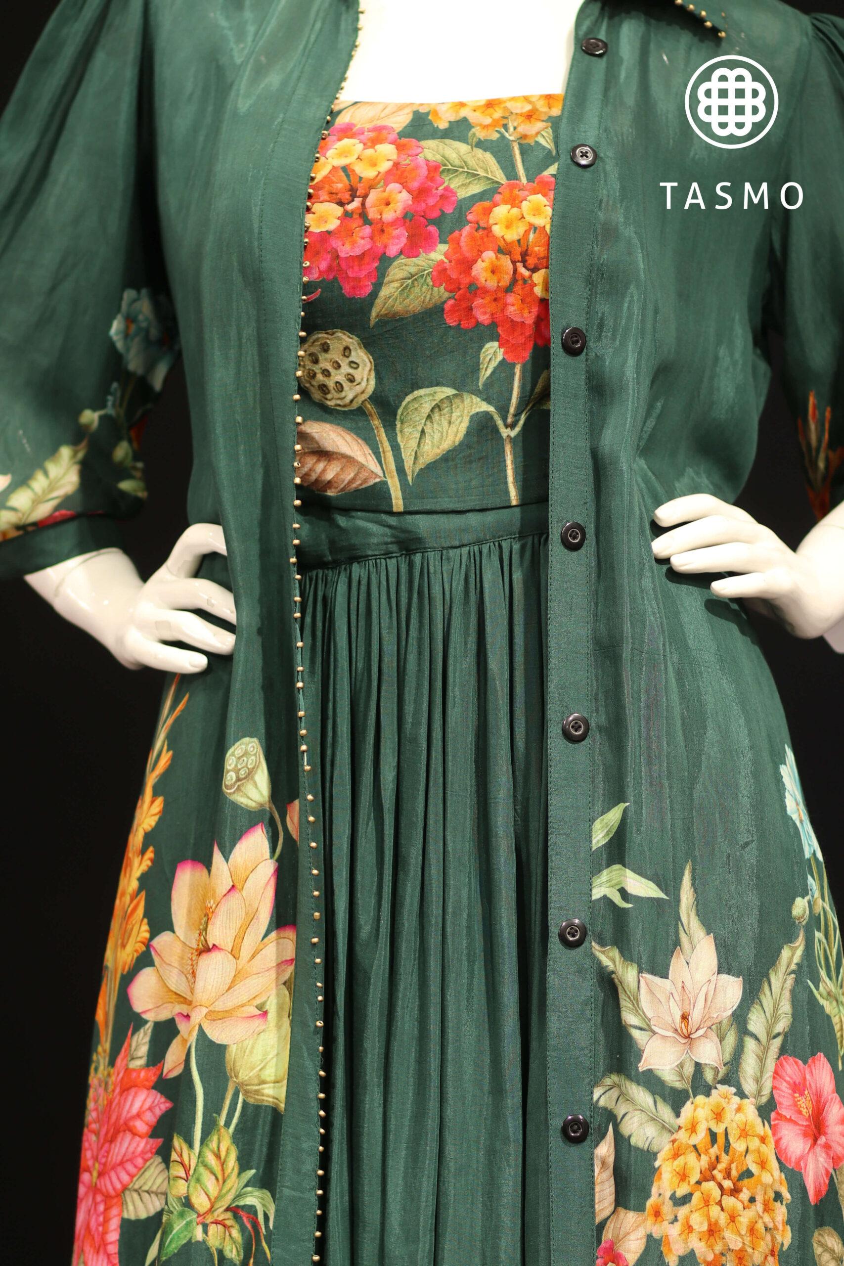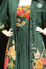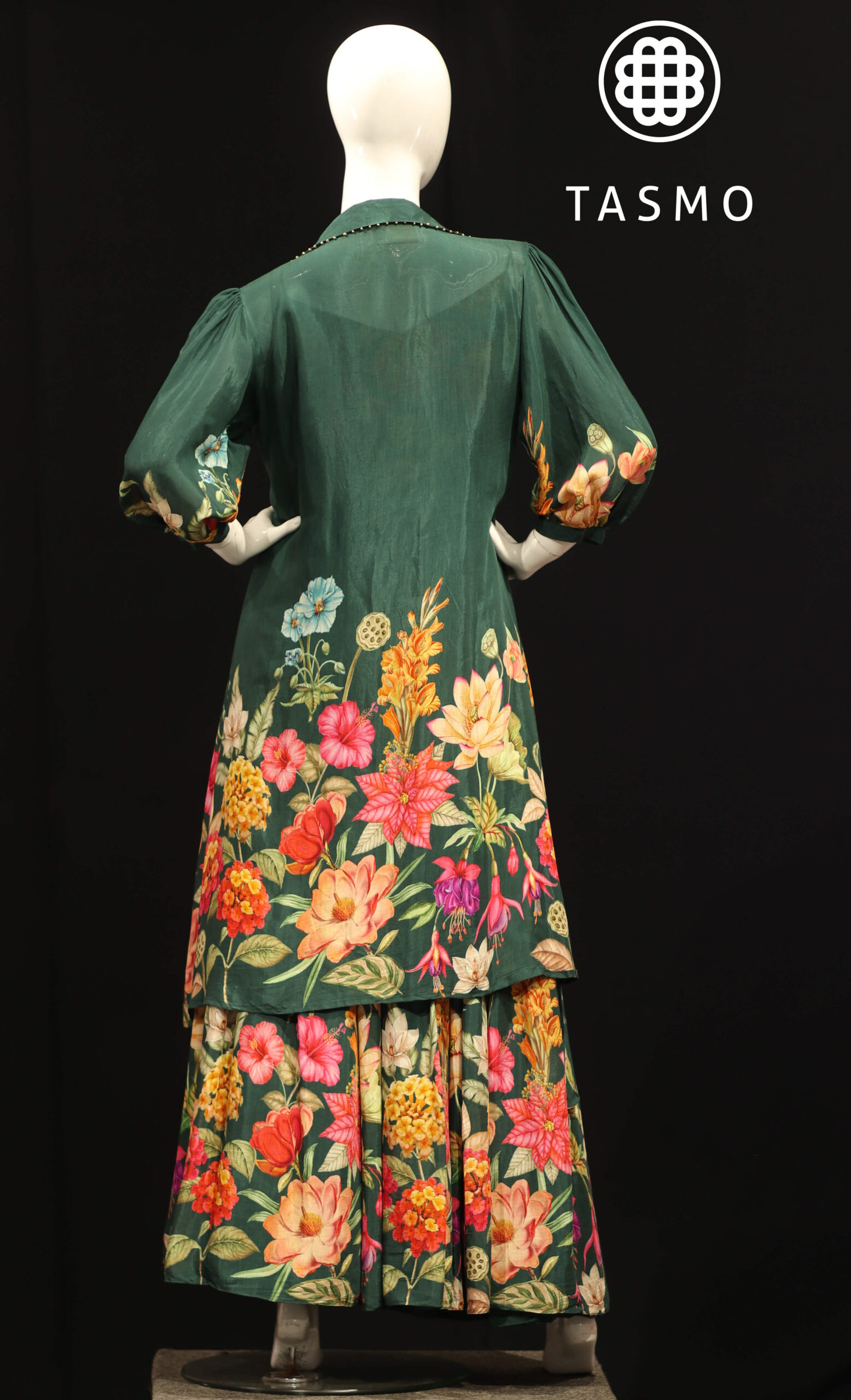 A three-piece ensemble crafted from pure cotton, featuring a delicate floral print. The set includes a chic crop top, a voluminous pleated skirt with graceful flair, and a flowing longline jacket—blending breezy elegance with timeless charm.