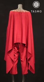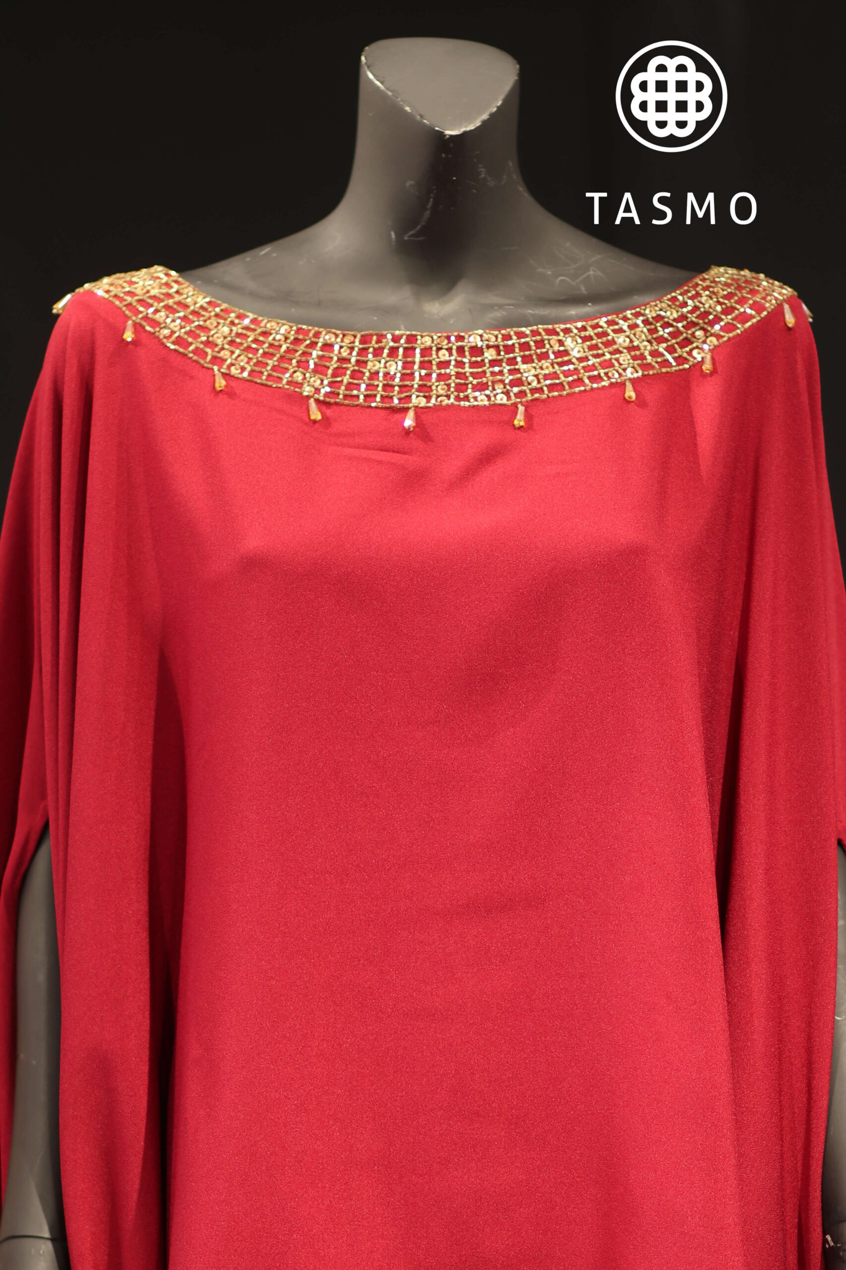 An opulent draped tunic in a bold ruby hue, this ensemble speaks volumes of understated grandeur. Crafted from fluid crepe, the silhouette flows effortlessly with an asymmetrical hem and cascading layers that exude ethereal elegance. The neckline is exquisitely hand-embellished with intricate gold beadwork and fine crystal detailing in a refined lattice pattern, finished with delicate hanging drops that catch the light with every movement. A timeless fusion of contemporary grace and artisanal luxury—perfect for soirees and elevated any gatherings.