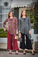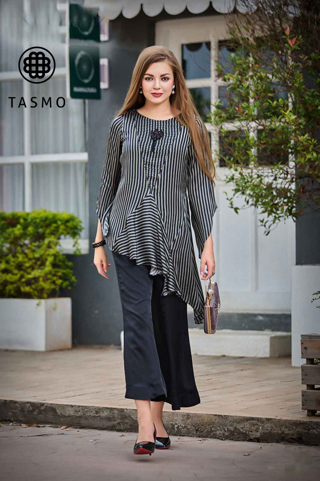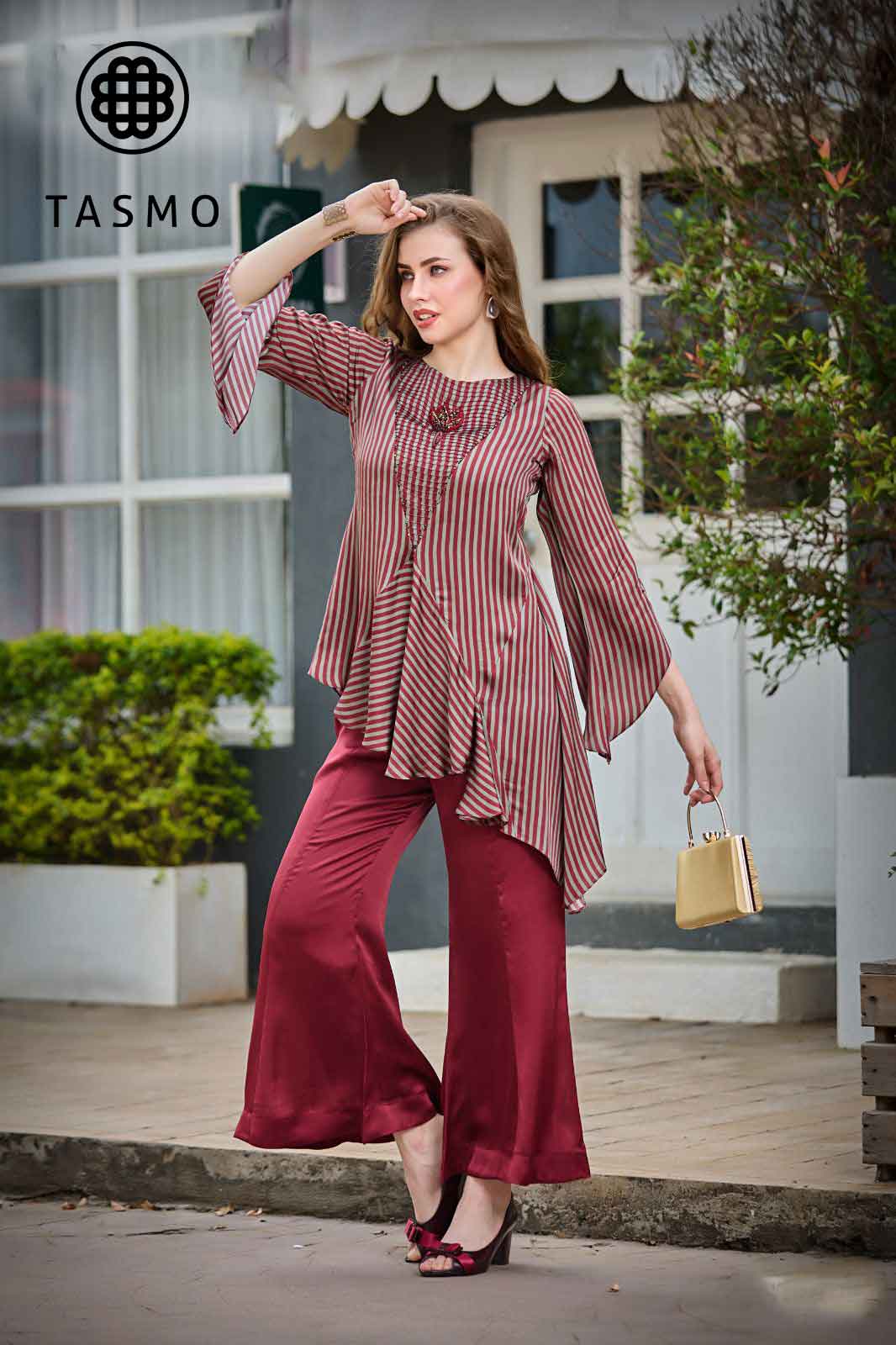 The striped asymmetrical tunic, with its flowing hemline and flared sleeves, creates graceful movement, while delicate embroidery at the neckline adds refined detail. Paired with wide-legged satin trousers in deep crimson, the look blends comfort, sophistication, and luxe appeal.