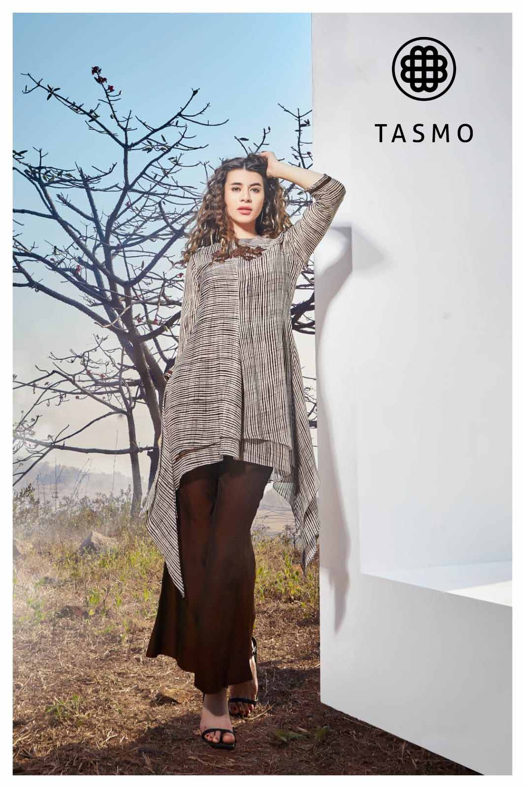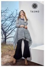 This ensemble exudes an aura of effortless sophistication — a fusion of contemporary artistry and timeless elegance. The top, crafted in a delicate monochrome striped fabric, cascades in an asymmetrical, handkerchief hemline, creating fluid movement with every step. The neckline is adorned with intricate navy embellishments, adding a refined touch of detail that whispers luxury without overpowering. Paired with dramatic wide-legged black trousers, the silhouette strikes a perfect balance between modern minimalism and regal grandeur. This look is not just an outfit but a declaration of poised femininity and cosmopolitan charm — an ode to understated luxury with a bold, confident edge.