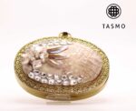 A graceful oval-shaped clutch, adorned with shimmering mother of pearl and encrusted with sparkling crystals and semi-precious stones, exuding timeless elegance and luxury..
