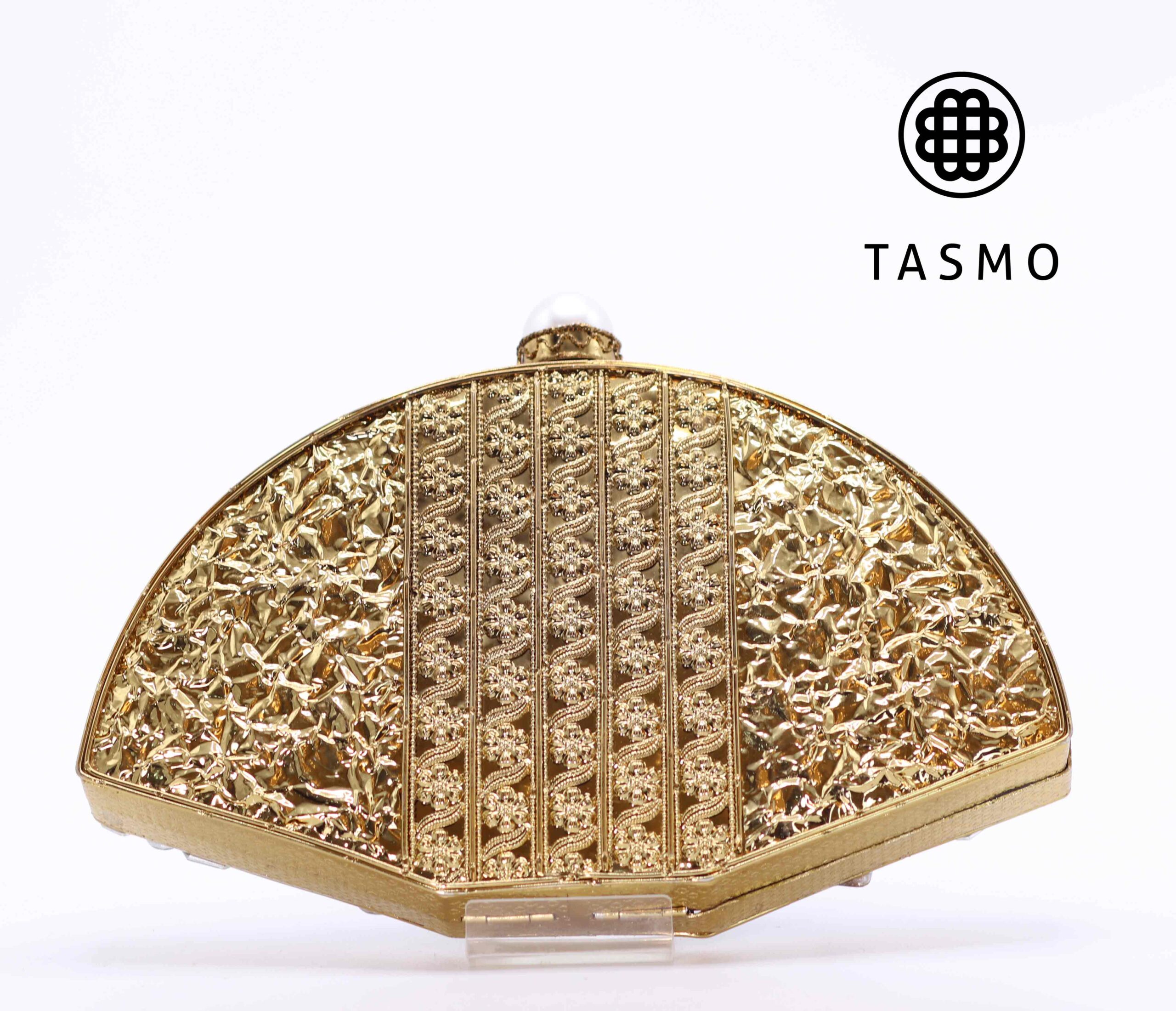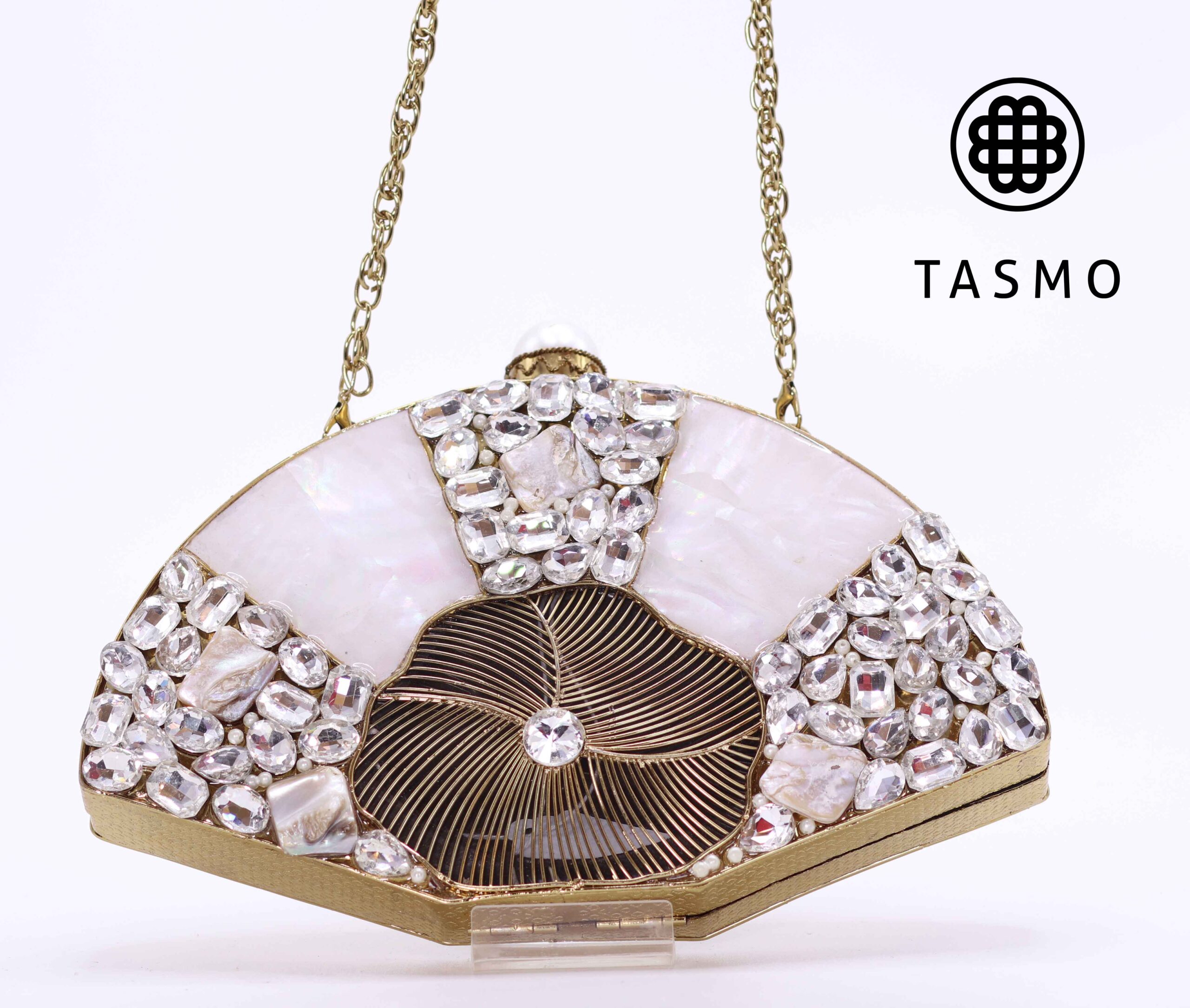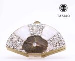 A true embodiment of artistry and opulence, this fan-shaped clutch is crafted in a radiant gold base and adorned with lustrous mother-of-pearl inlays, sparkling crystal clusters, and intricate detailing. At its heart lies an exquisite golden motif crowned with a single brilliant stone, radiating timeless elegance. Sophisticated and luminous, this clutch is more than an accessory — it is a statement piece, designed to captivate with every glance.