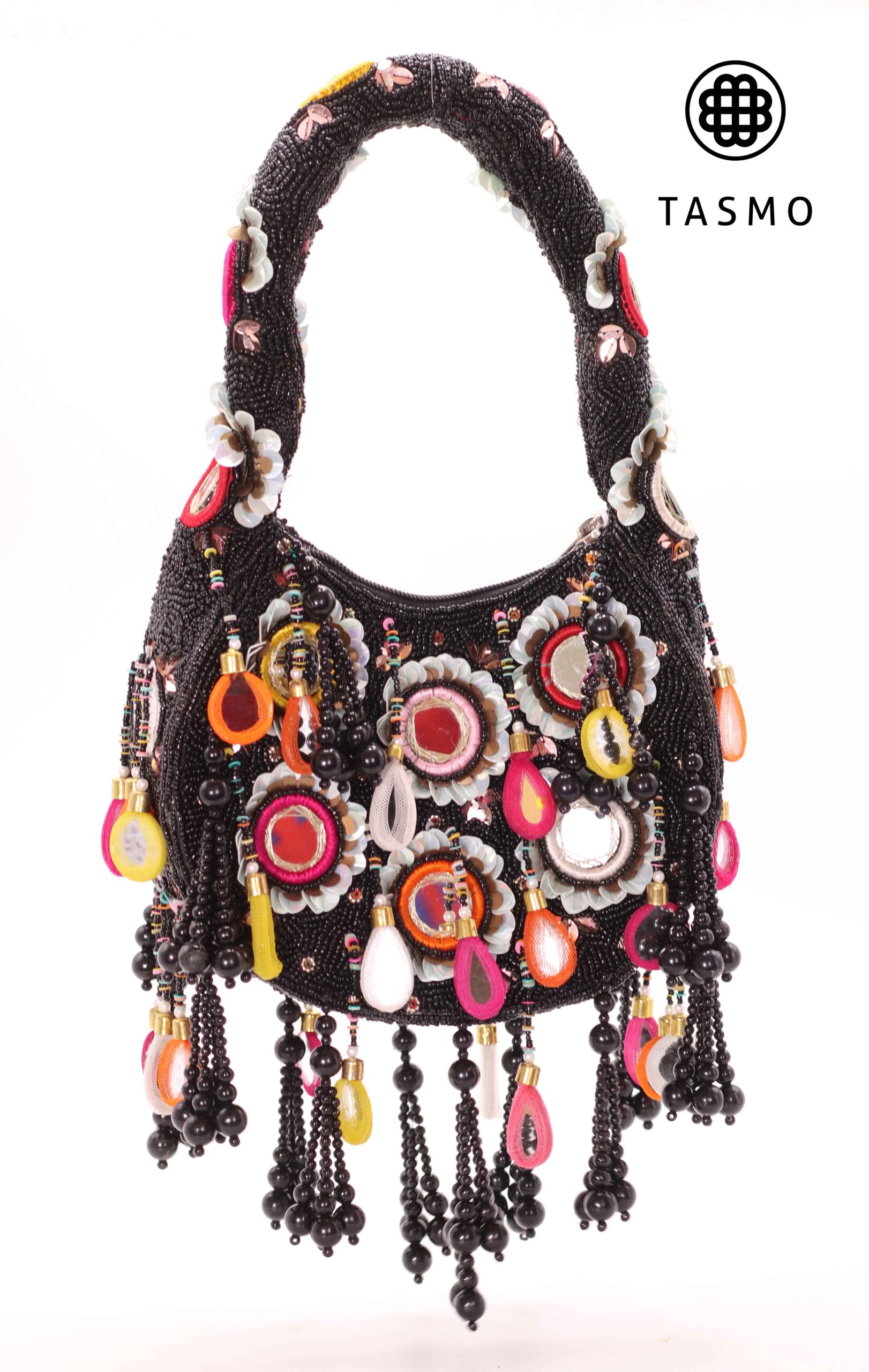 A striking fully beaded white handbag, intricately embellished with multicolor net mirror work detailing that shimmers with every movement. Finished with graceful white pearl tassels, this masterpiece blends bold artistry with timeless luxury.